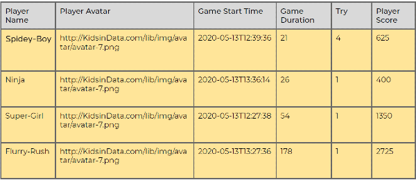 Lets start from the bottom of the pyramid, the raw data. The below table shows the raw data as the KiD platform captures it. Its a lot of information but not really organised well. Column labels, date format is not presented in an user friendly manner. It contains lots of noise (E.g., the players' avatar location etc) which may not be relevant for the questions children are trying to answer with this data.